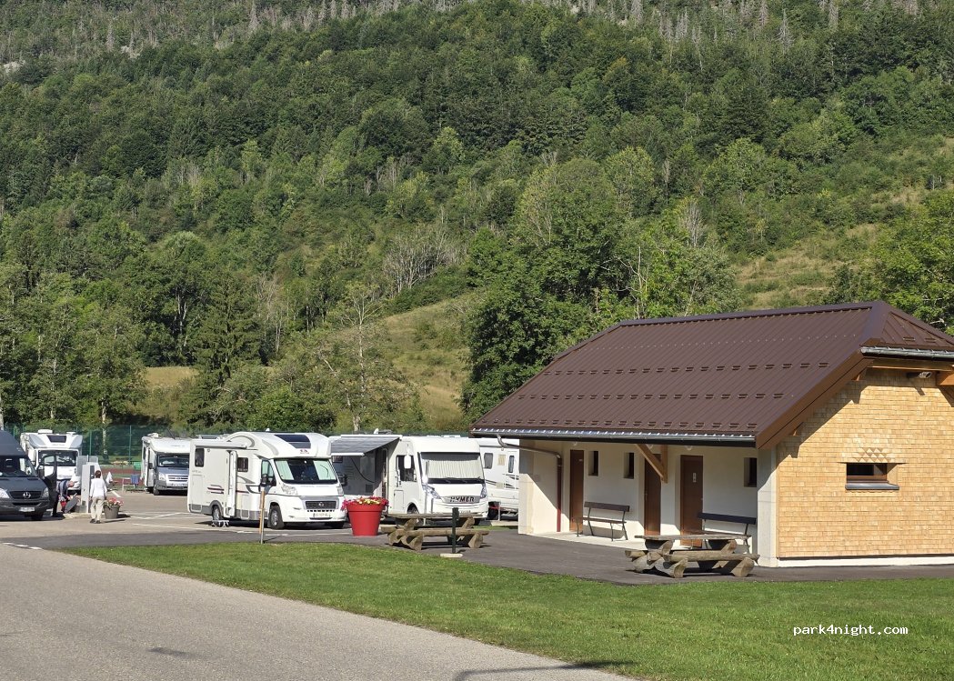 Merci à la commune pour cet espace. la route est passante mais calme la nuit. si chacun se gare raisonnablement, il peut y avoir 8 à 10 emplacements. tarifs des services sont raisonnables. bonne situation pour accéder à la télécabine qui permet de rejoindre le Crêt des Neiges qui devient ainsi une balade familiale. peu de commerces sur le village, mais un boulanger !