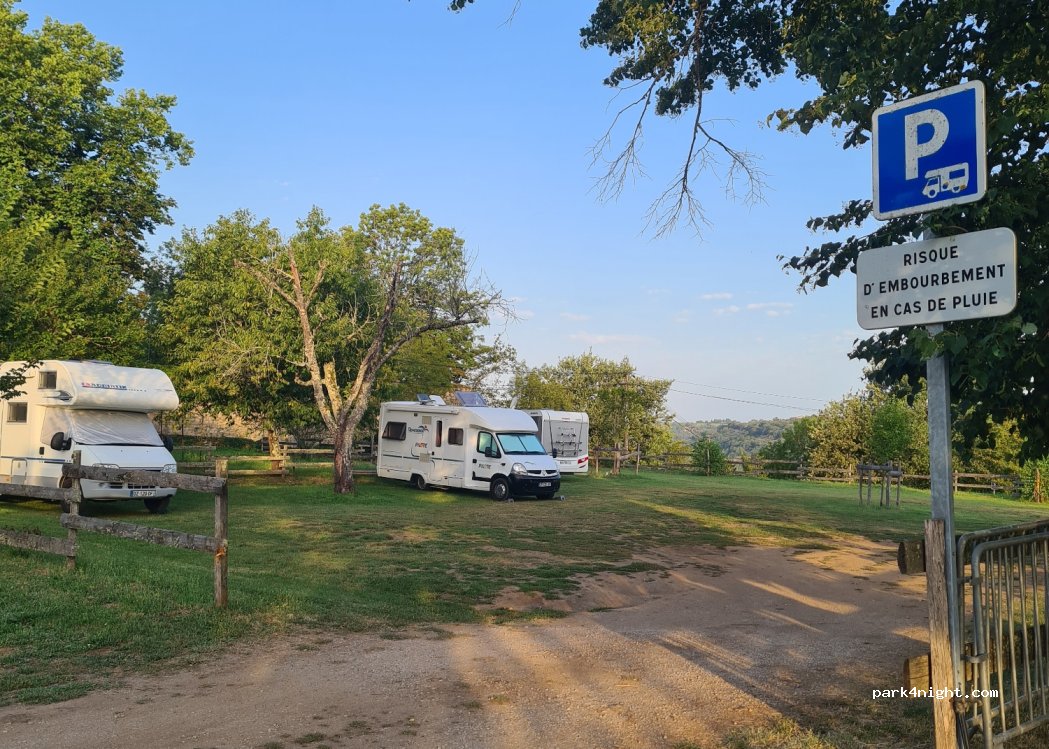 Dedicated parking for motorhomes. In front of the old village of Capdenac, classified as one of the most beautiful villages in France. Parking on grass. Close to a fairly quiet road. Quiet. Toilets on the village square, a little further up at 30 m. No services in the parking lot, but a few shops in the village. Nice view, flat, quite a few spaces. Pets allowed, but you have to pick up the droppings. Good internet reception. Pétanque ground opposite.