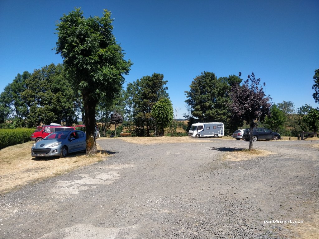 Grand parking, table pic nic et bancs, jolie vue sur la vallée. Parfait pour visiter la ville. Toilettes accolées au cimetière du bas et point d'eau. Attention pente raide, rues étroites, et virages serrés pour les grandes longueurs. Ok pour nous, camping car 5m.
