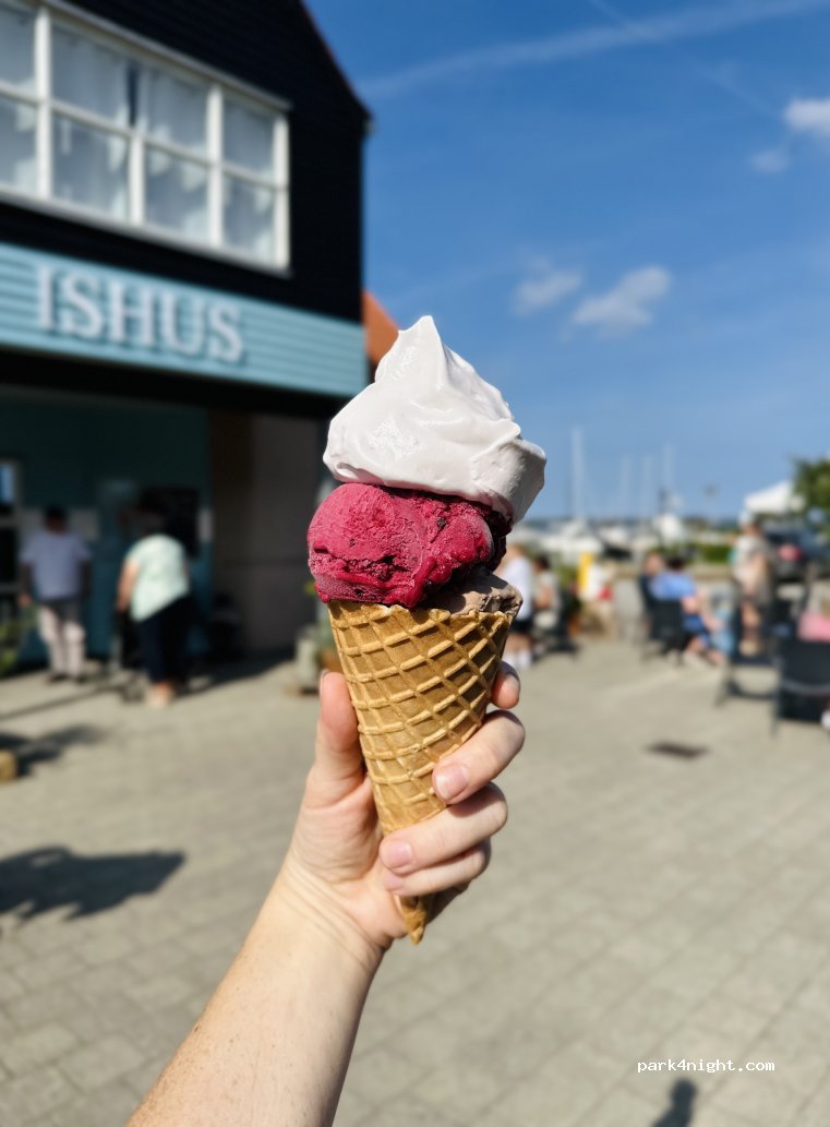 Direkt am Hafen. Kleiner Supermarkt in der Nähe. Ebenso Eisladen und ein Campingplatz. Aber der Hammer sind die Dodeklitten. 10 Min. Fussmarsch. Der Weg und der Besuch haben sich gelohnt.