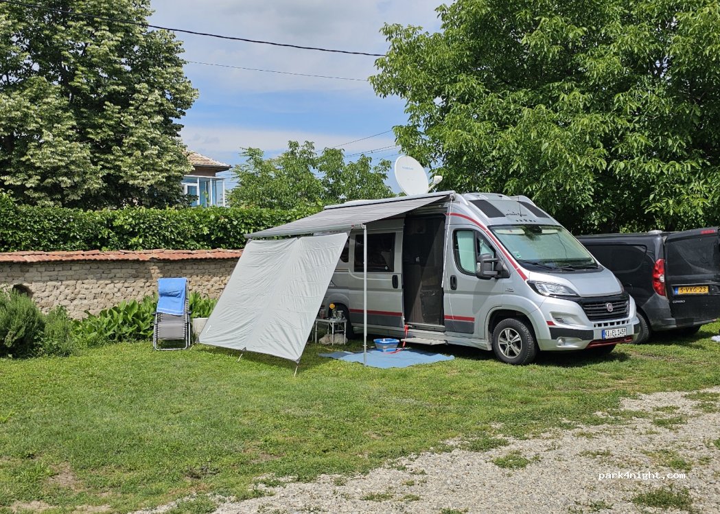 Parking spaces in the garden of a family home. Shade is only intermittent. The owners were friendly and accommodating. It was relatively noisy at night. The price is 40 lev per night for a camper pitch and in my opinion too expensive. Washing machine plus 4 lev.