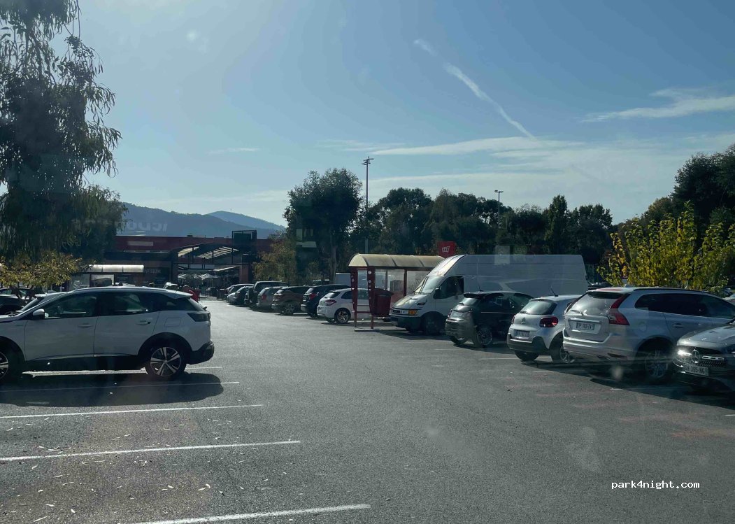 Ça reste un parking de super marché. ( gratuit ) De mombreux camping car ont passé plusieurs nuits ici pour la fête des mimosas c'était toléré. Idéal pour visiter la ville ou le bord de mer en journée, à condition de marcher environ 20 minutes. De toutes façons, il n'y a pas beaucoup d'autres solutions de parking. GPL à la station.