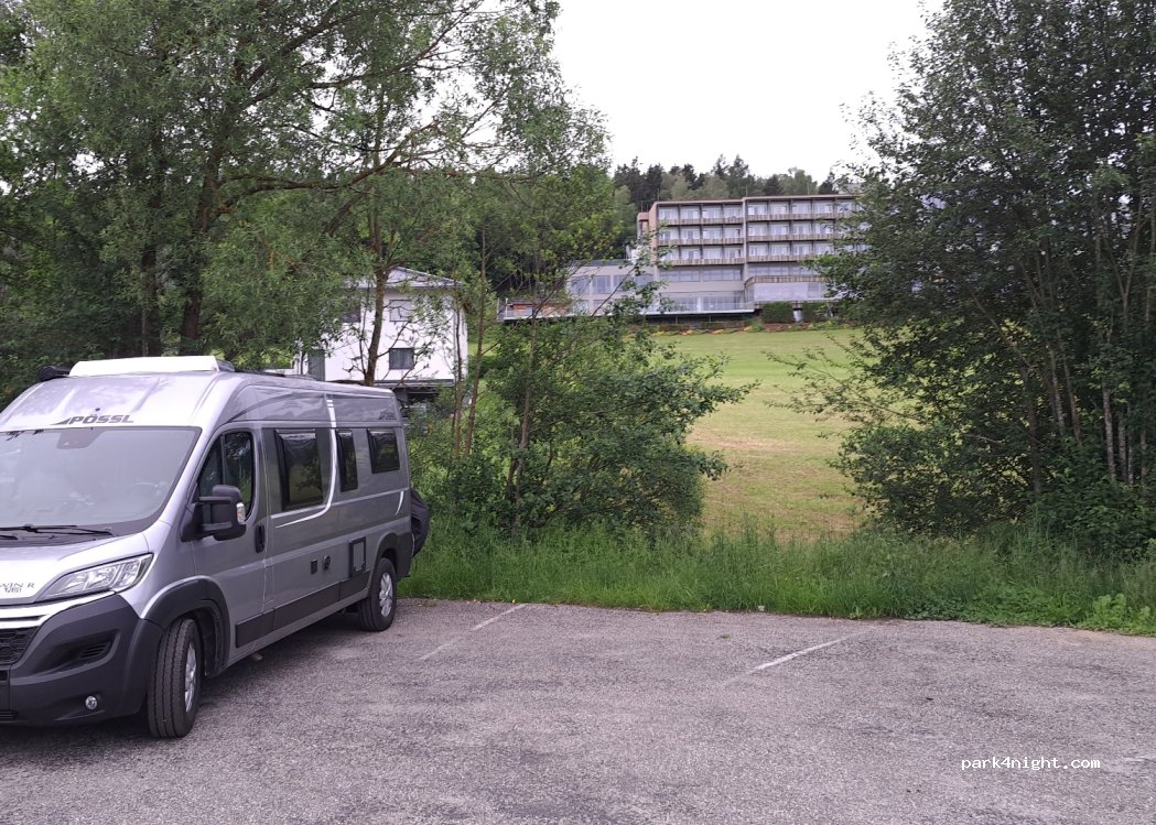 Byli jsme tu přes noc sami, krásný klid. 3 místa pro karavany s dodatkovou tabulkou od 18h do 9h. Zůstali jsme až do oběda a nevadilo to, byl všední den a prázdno. Vedle hezké malé koupaliště za 4 eura a okruh lesem se zastávkami pro deti.