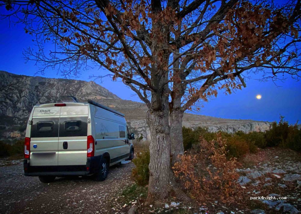 Bellissimo parcheggio all’imbocco del sentiero de l’Imbut per fare un trekking nelle Gole del Verdon. Di giorno abbastanza frequentato , di notte non c’è praticamente nessuno, solo un dolce Cinghiale selvatico, Pumba, che gira indisturbato tra le piazzole :-) c’è solo un albergo con ristorante nel raggio di 20 km, arrivate già forniti di tutto.