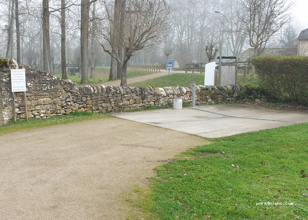 Très bien, service complet; eau et vidanges. A proximité d'une rivière et d'une petite route avec peu de circulation. Le village est charmant, avec ses commerces et chez Carles vous trouverez du foie gras et autre préparation fait localement. Merci à la municipalité pour cet emplacement.
