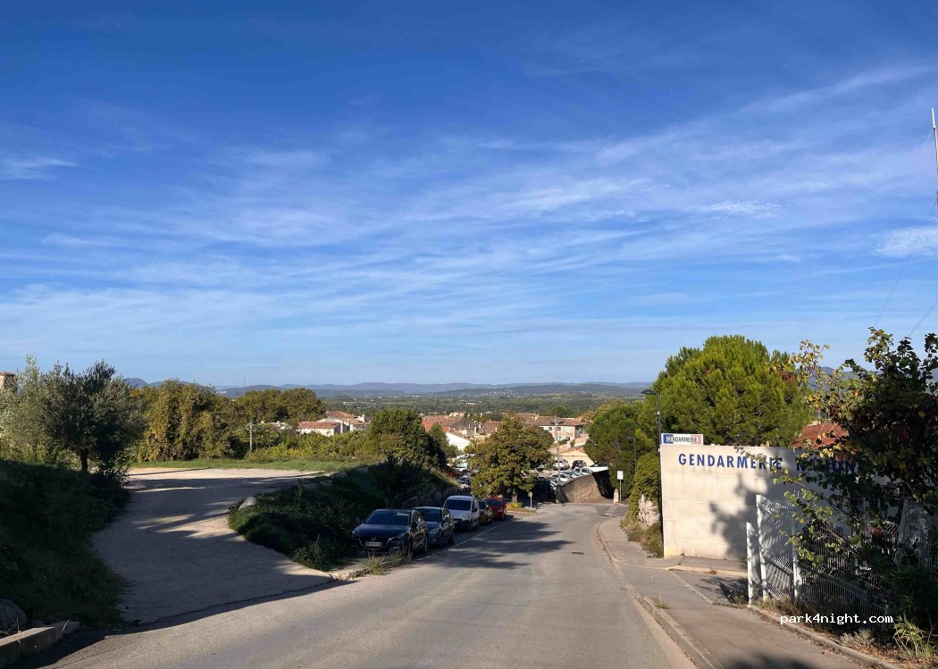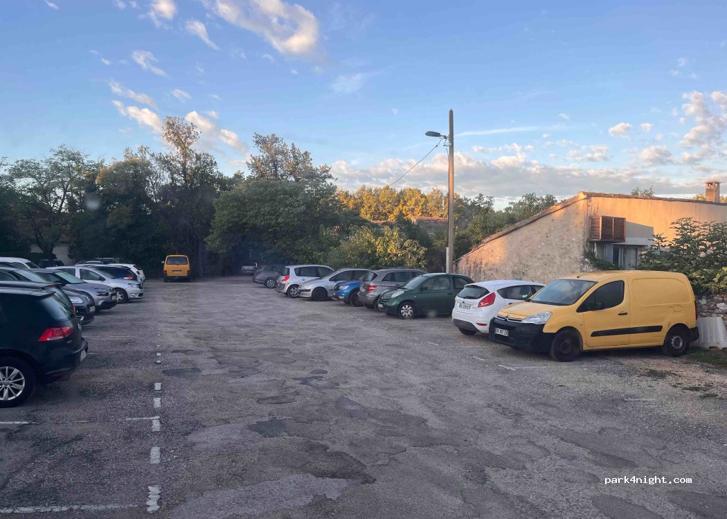 parking gratuit avec en bas beaucoup de voitures des habitants la partie haute est accessible soit par une petite pente raide depuis le bas soit par une entrée en face de la gendarmerie Le parking est accessible toutes hauteurs par la route de St Guilhem aucun problème de places en haut nuit calme