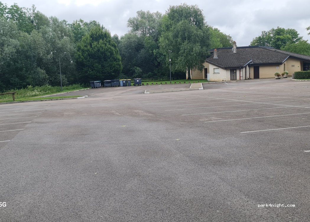 Parking plutot vaste. Peu frequenté : 5 ou 6 voitures en fin d'apres midi avec enfants. Poubelles ok. Toilettes de la salle inutilisables. Quelques tables et banc ombragés. Eurovelo 6 juste a coté.
