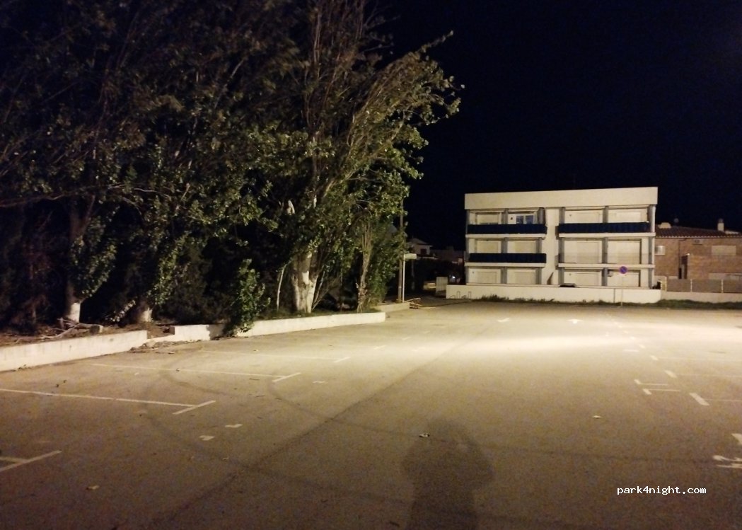 desde la carretera no se ve el parking q hay detrás del supermercado...entrando en el parquing desde la carretera al final a mano izquierda está el camino que te lleva al parquing del supermercado.....si no entras no se ve...gran esplanada sin ruidos y muy tranquilo.sin servicios y cerca de la playa el centro y bares y restaurantes.al lado de la iglesia hay una fuente y las basuras..