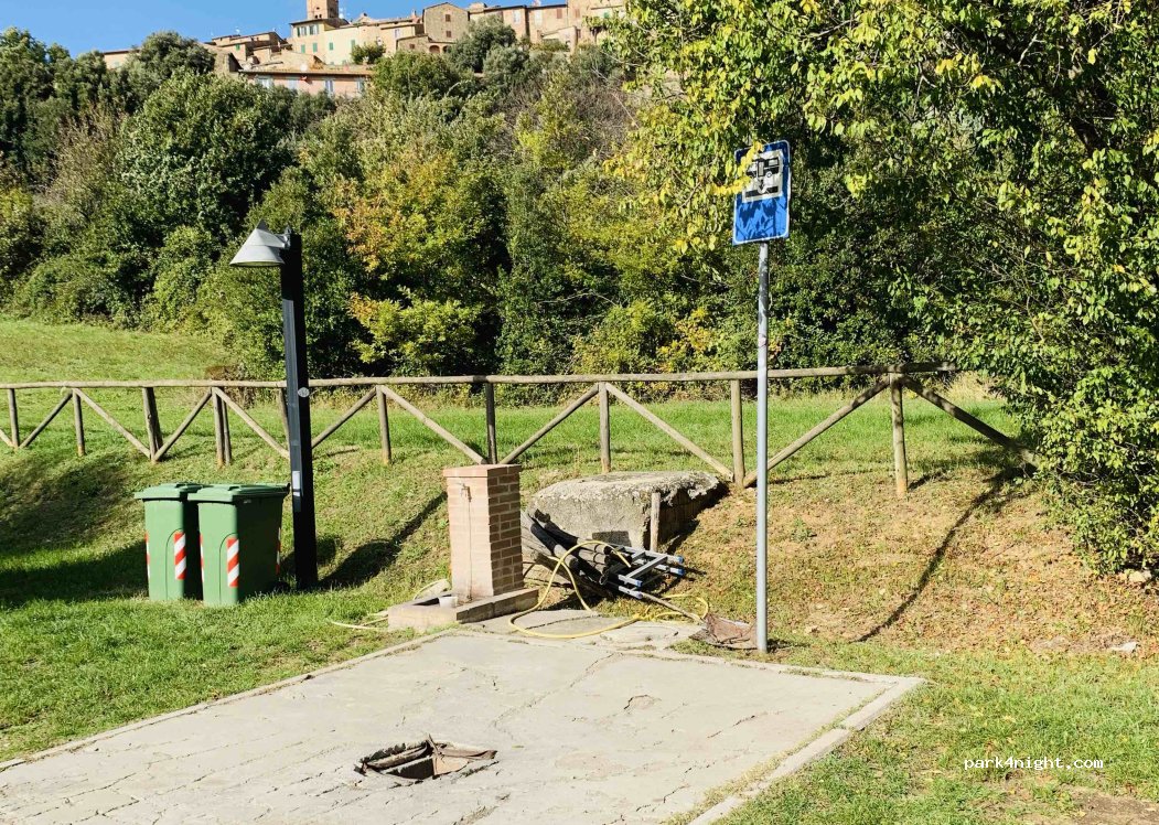 Beautiful parking space created by the municipality below the small mountain village of Radicondoli. Fresh water and disposal available. A power column with 8 connections available free of charge. The approach from the north through the city is quite steep. A flat square surrounded by greenery, very quiet and 5 minutes' walk from the old town. Many thanks to the city for this beautiful and free service. We feel very welcome
