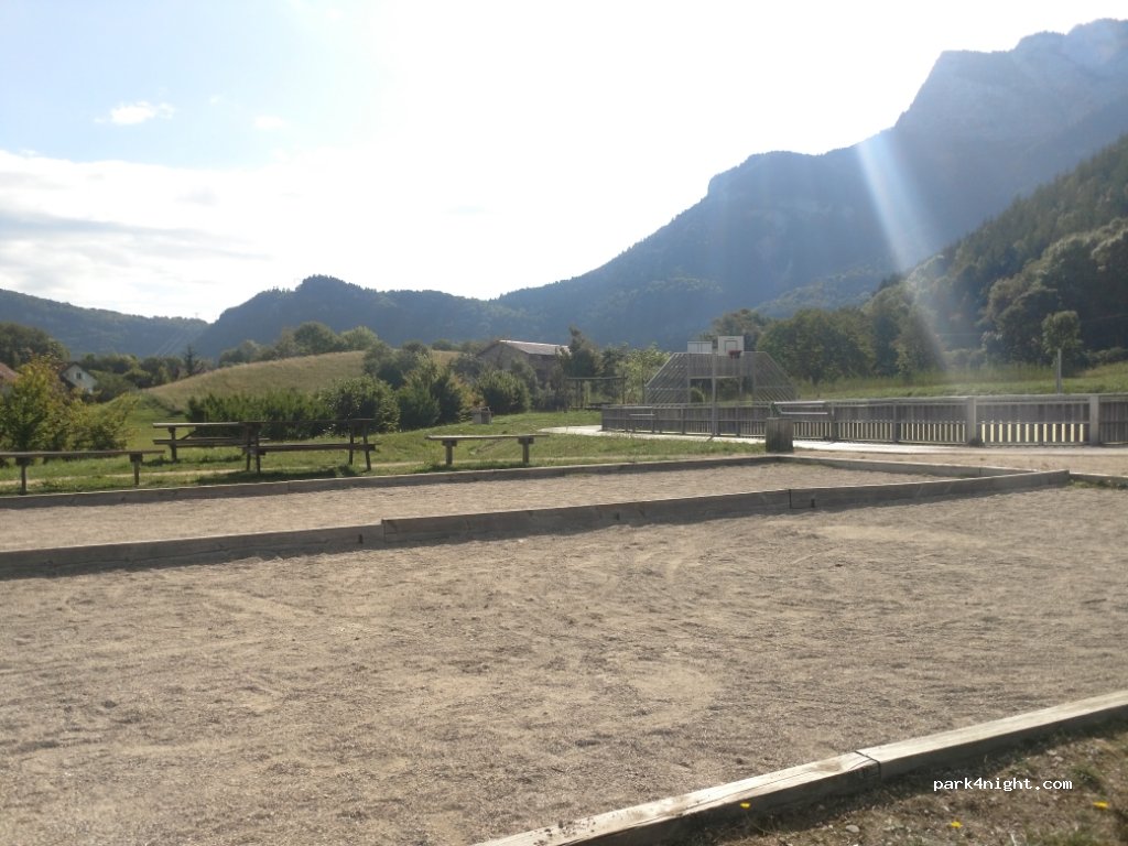 Bien pour une halte avec les enfants il y a un espace jeu et pétanque. Prêt de la route de la circulation en début de soirée