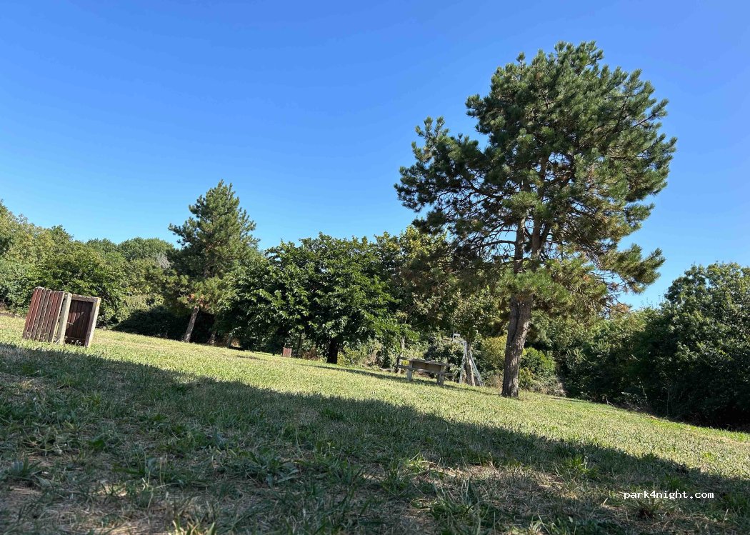 en bordure de route, pas trop passante, 3/4 places sous les arbres, tables de pique nique ,ping pong, foot. bien pour une pause.