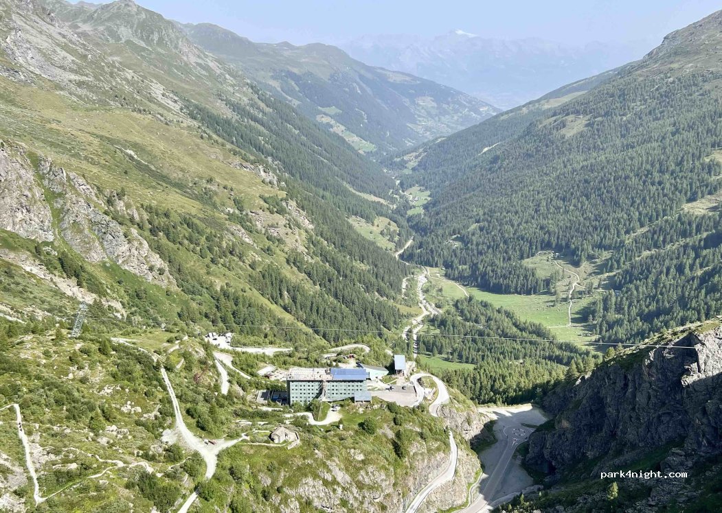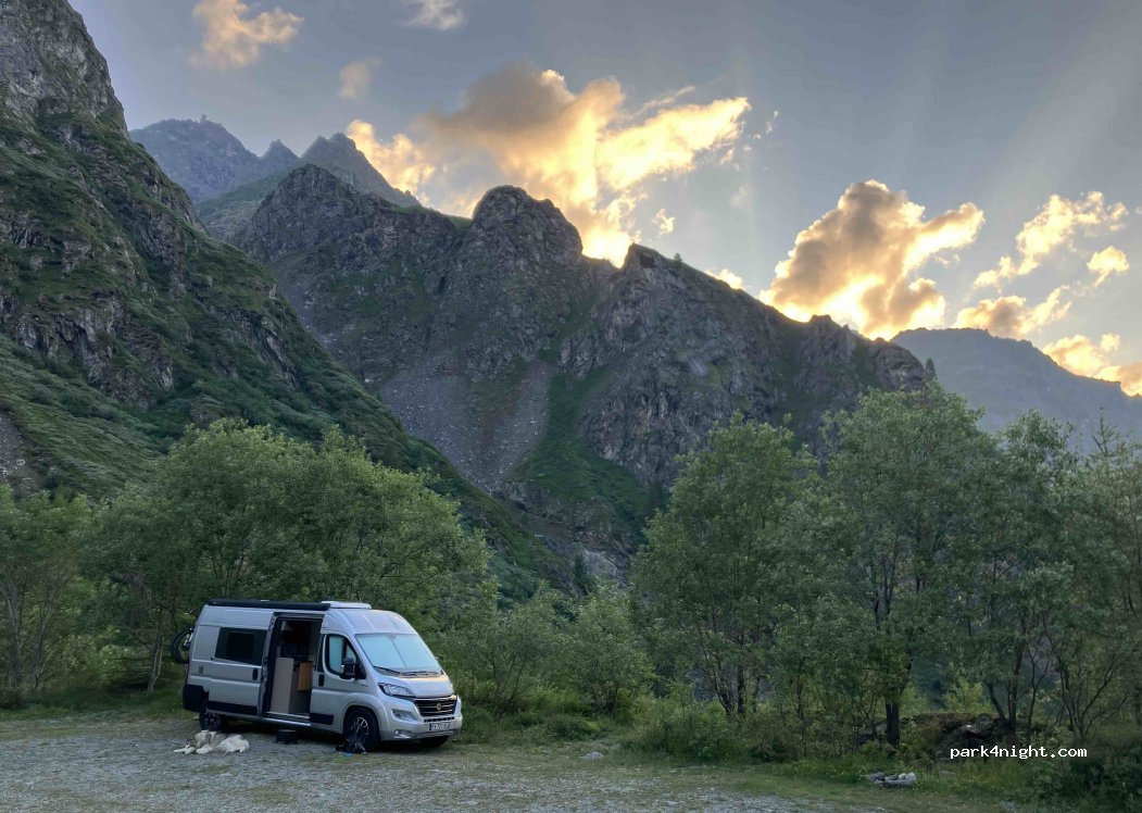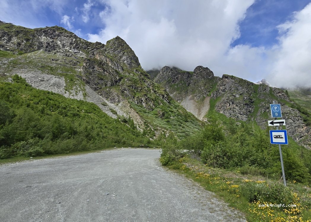 Nous y avons passé une nuit sur le grand parking, quelques van présent, très calme, vu incroyable chute d’eau, vallée et barrage. WC et eau potable très propre au niveau du téléphérique un peu plus haut. Bon départ de randonnée vers le barrage.