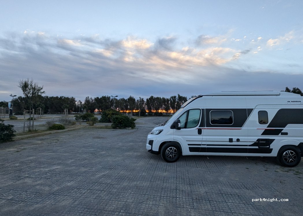 Large parking near the beach. It's free of charge during the winter months. During summer it's paid parking, and most likely more crounded than now. There is a hight limit of 2.2m to enter the parking area. We had a very peaceful and quiet night. Recommended during low season. Toilets and showers available during summer.