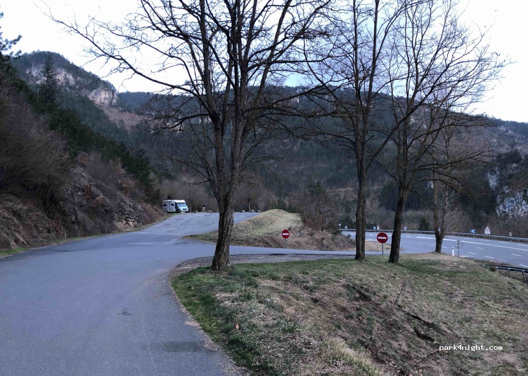 Parking en hauteur par rapport à la route, avec tables et poubelles. Parfait pour une pause et Possibilité de passer la nuit malgré la nationale assez passante