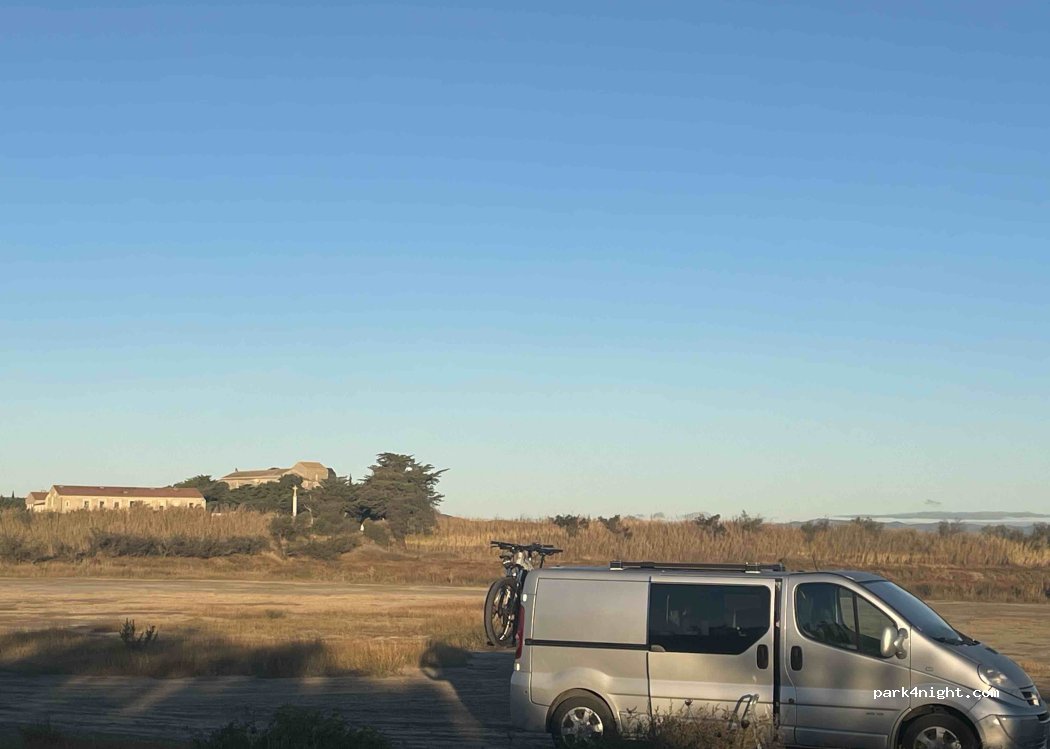 Stationné le 23/09 : pas de problème d accès et gratuit, nous etions 5 vans. Terrain plats et environnement agréable (etang avec flamands roses, accès facila au plage, beau coucher de soleil sur la cathedrale). Attention moustiques