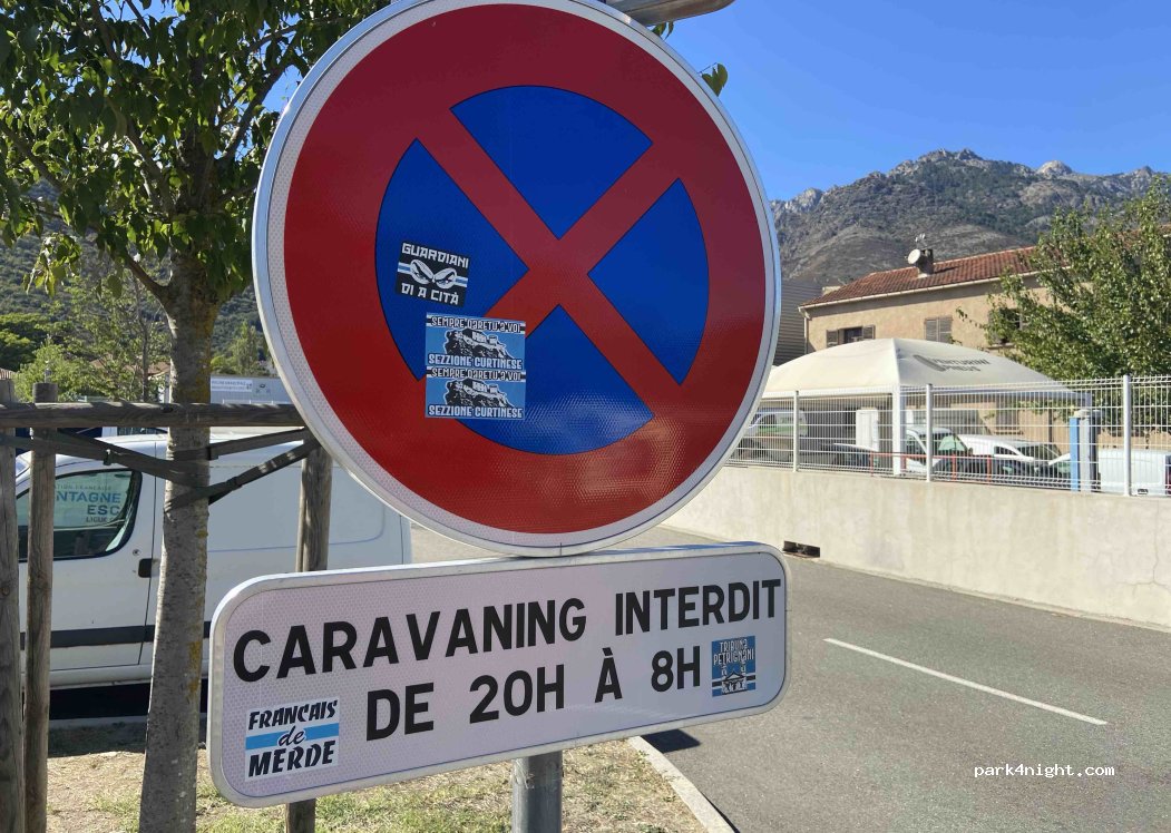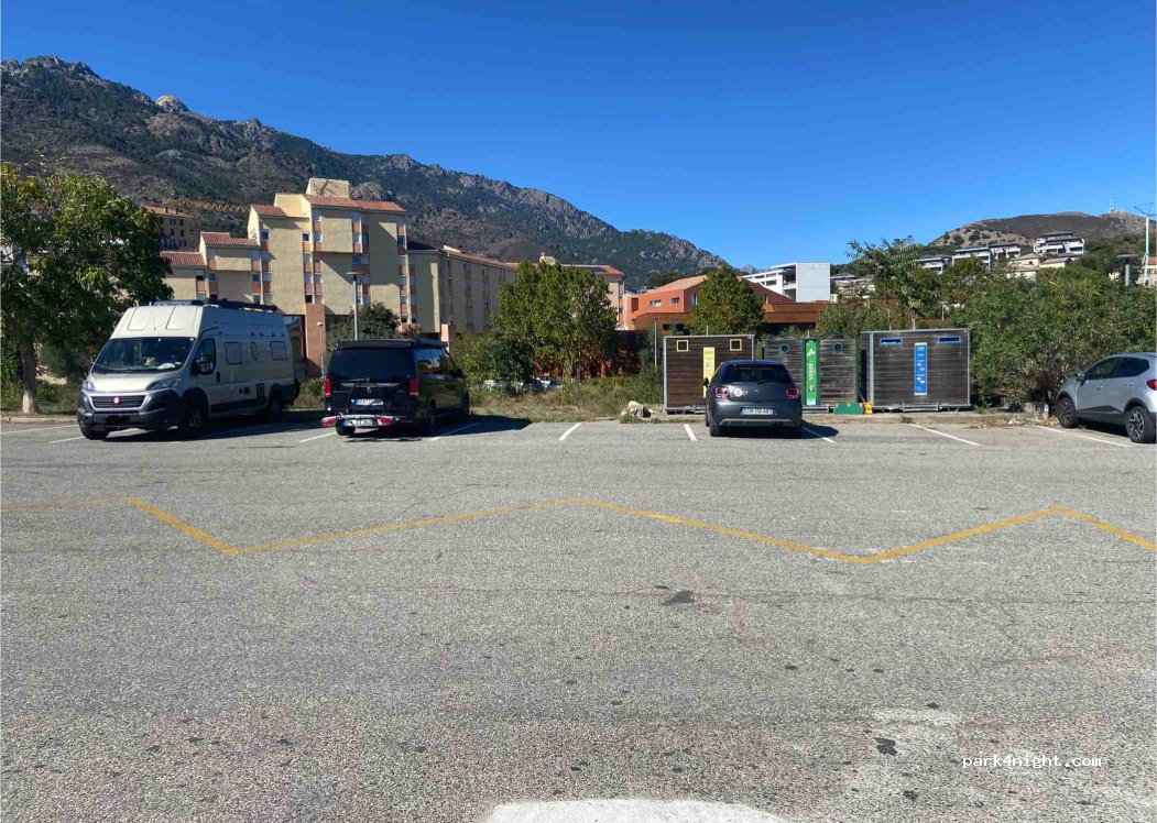 Le parking a depuis été aménagé. Très bon endroit pour se garer gratuitement afin de visiter Corte. On peut remonter en ville en coupant par la passerelle. Nous n'avons pas tenté d'y dormir.