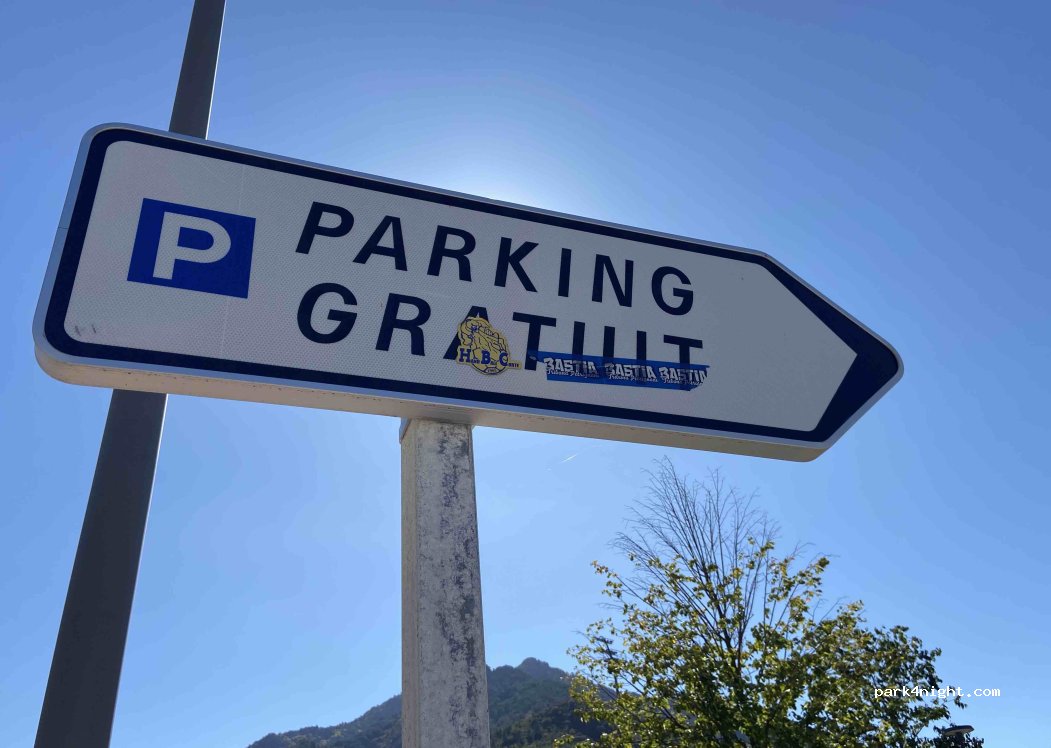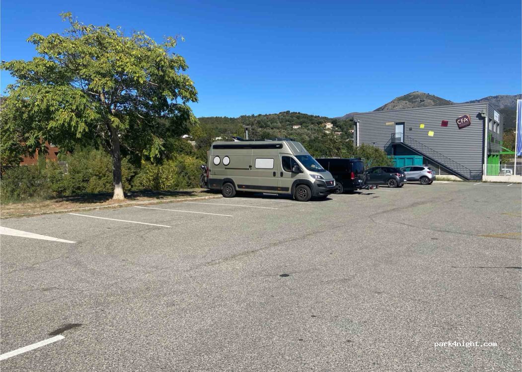 Parking officiel gratuit de la municipalité. Stationnement interdit aux camping-cars la nuit. Passez devant la piscine et les résidences étudiantes, traversez un pont suspendu pour rejoindre le village et montez les nombreuses marches jusqu'au Belvédère. Face au parking de la gare, le petit train touristique traverse le village. De nombreuses poubelles et conteneurs de recyclage sont à disposition. Une piste cyclable part du parking. Quelques places de stationnement permettent aux véhicules plus longs de surplomber la pelouse.