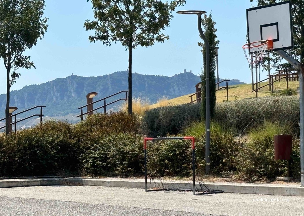 Un semplice parcheggio vicino a una chiesa con una magnifica vista su San Marino.