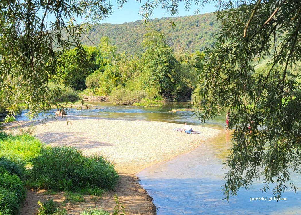 Tagsüber war die Schranke geöffnet, wir waren zwischen 17 und 19 Uhr hier. Parkplätze nur für kurze Fahrzeuge (<5m). Großer Badespaß im Fluß insbesondere für Kinder und Junggebliebene. Schöner Liegebereich auf einer kleinen Insel.