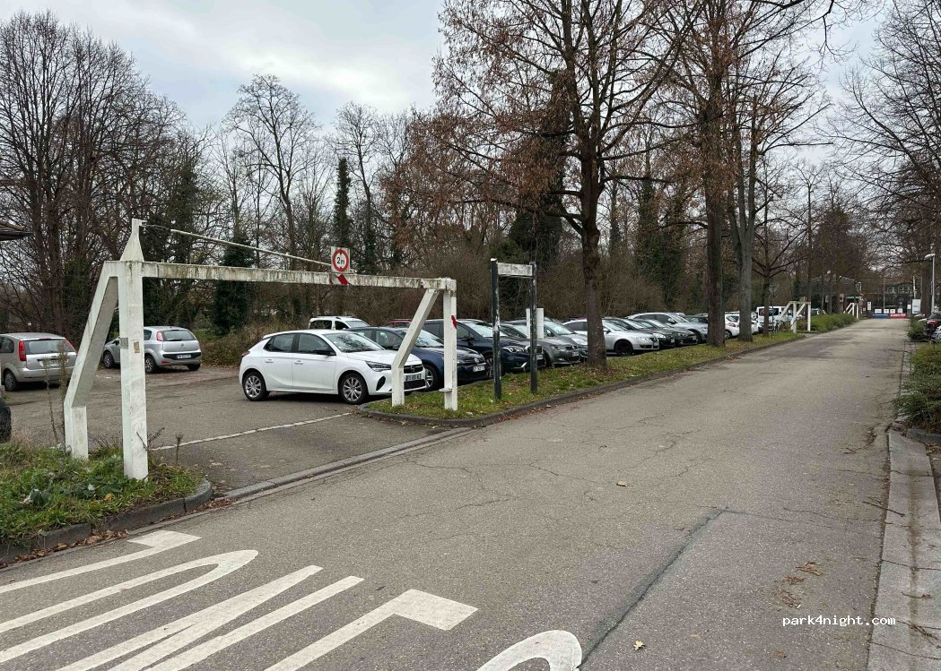 Parking gratuit devant le CREPS. Nombreuses places. Grands arbres. (Barre de hauteur à gauche, dix places de stationnement illimitées à droite)