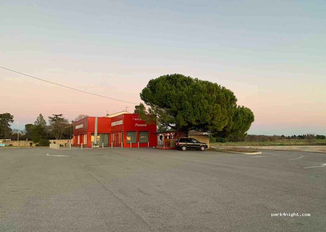 Terrain vaste avec boulangerie et pizzeria à proximité (que nous n'avons pas testé). déchets et nid de poule. ok pour une nuit.