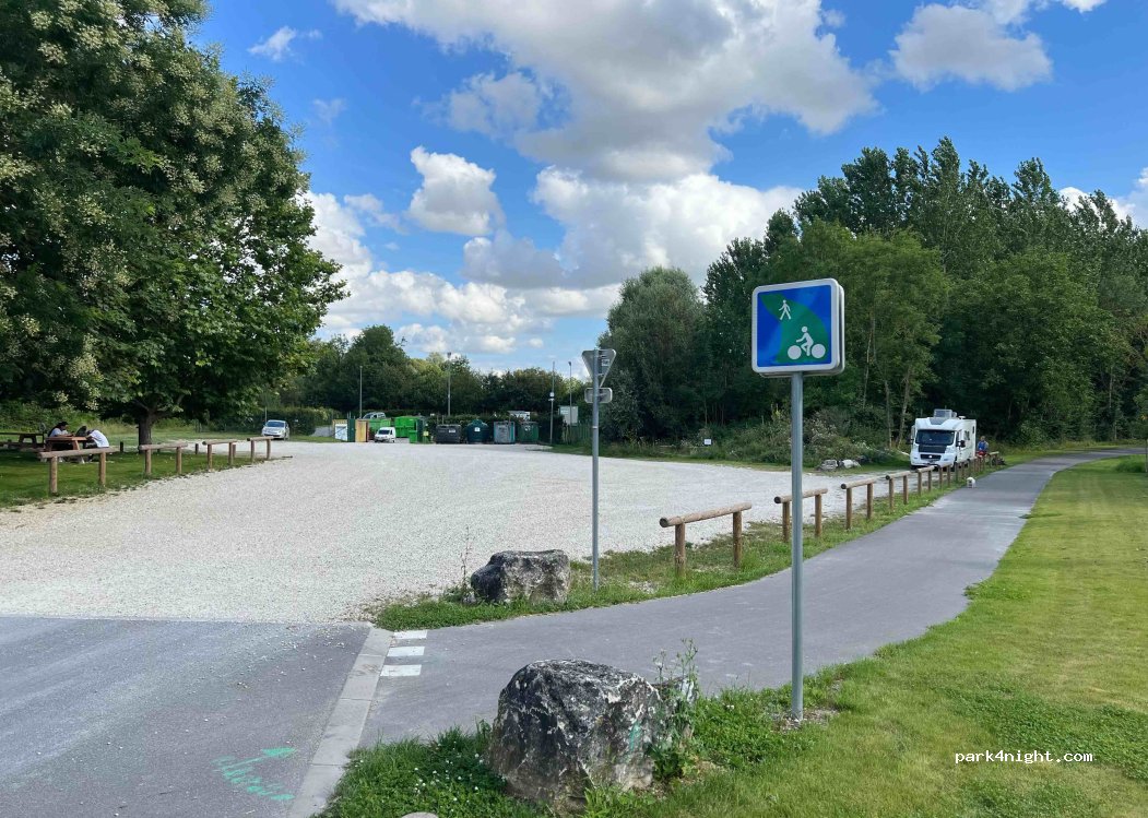 Parking en gravier simple et calme. Poubelle, tables et terrains de pétanque. Calme pour une nuit. Voisin de la déchèterie qui ouvre à 9h mais ne semble pas être une nuisance.