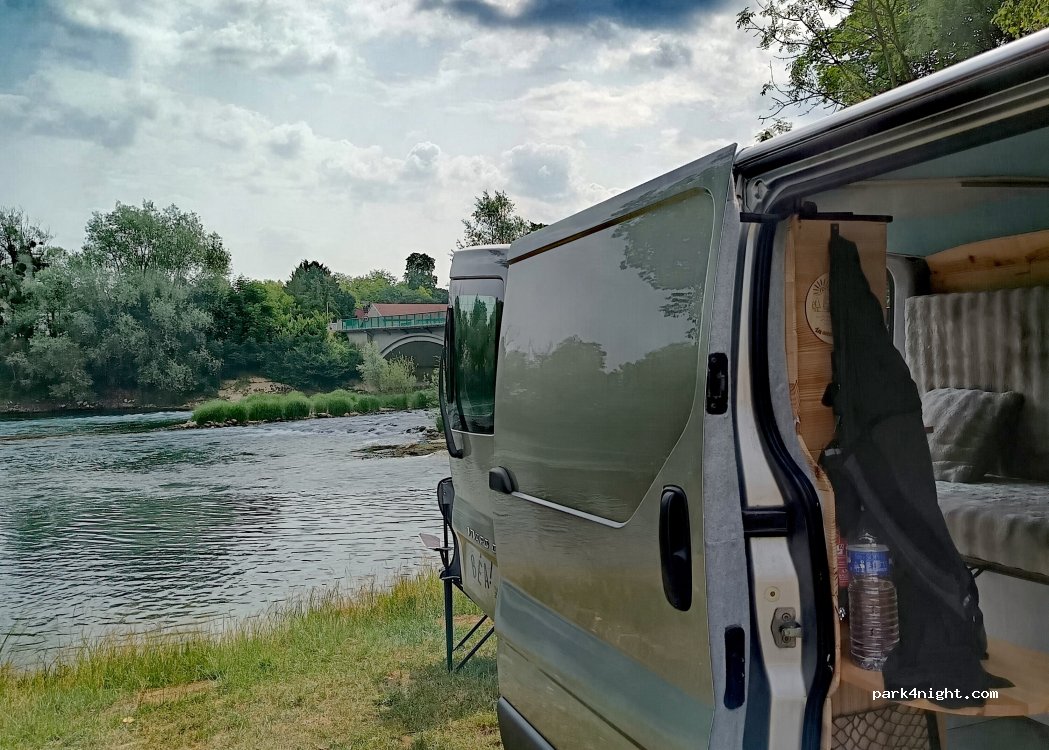 Lovely quiet spot near river with some shade later in day (August). Had a good nights sleep. A few truck drivers parked here but the didn’t cause any issue or noise. Would stay here again as a quiet nights alternative to staying in Chalon itself where parking is tricky.