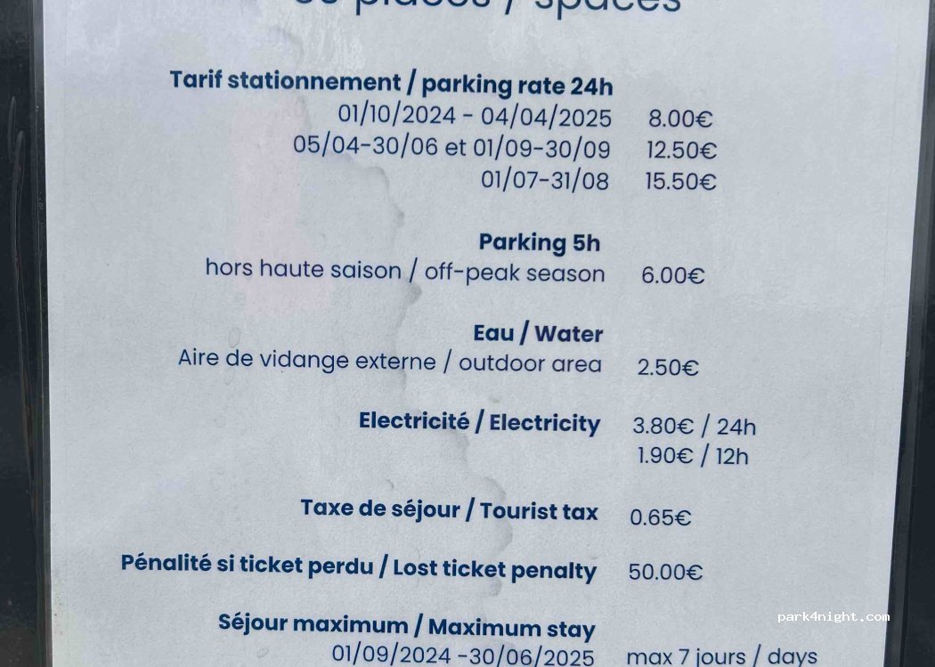 Maximale verblijfsduur: laag- en middenseizoen 7 dagen, hoogseizoen 4 dagen.
