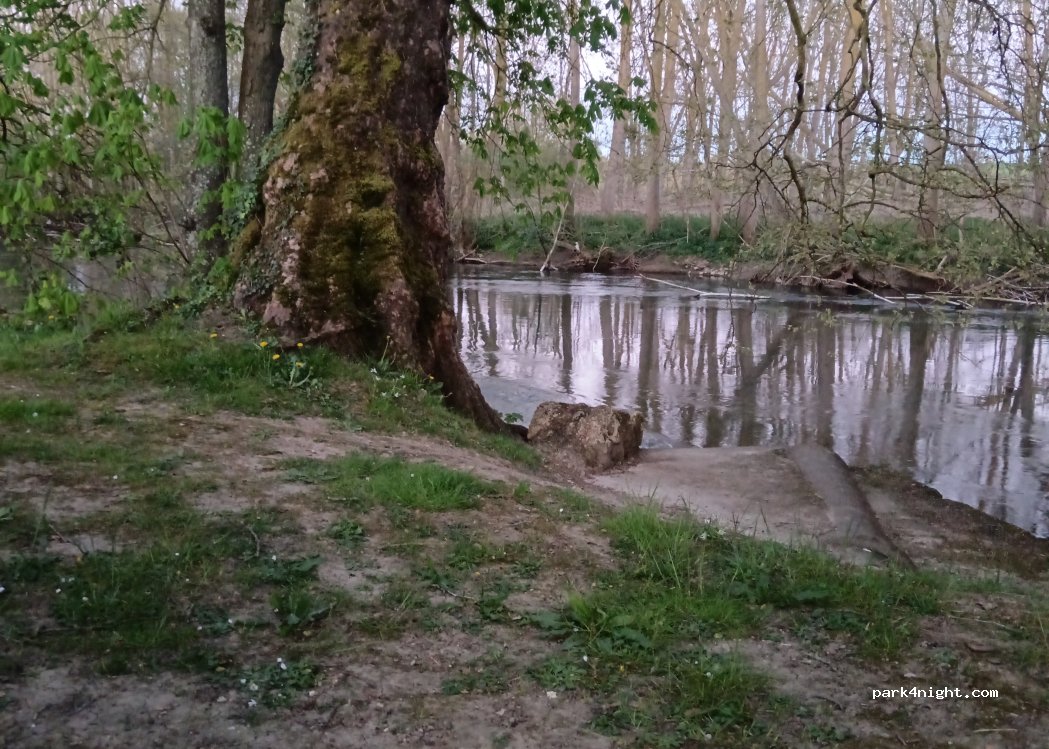 Salut, lieu calme à côté d'une rivière. il y a un terrain de foot et des aires de jeux pour les enfants, un skatepark. pour les van. hauteur limite 2,2m.