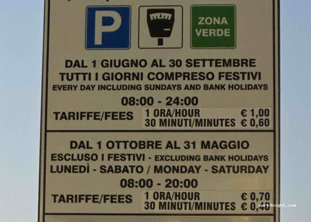 Ho prontamente richiesto di aggiungere una foto alla presentazione di questo parcheggio in quanto i prezzi sono nettamente differenti dalla descrizione. In alta stagione 1€ all’ ora dalle 8 alle 24. Notte gratuita. Per il resto ottimo, vicino al centro , pianeggiante , su asfalto, strisce blu, vista mare a 20 metri. (Park da 6 metri) “io con 7.50 invadevo due posteggi ma nessun richiamo”