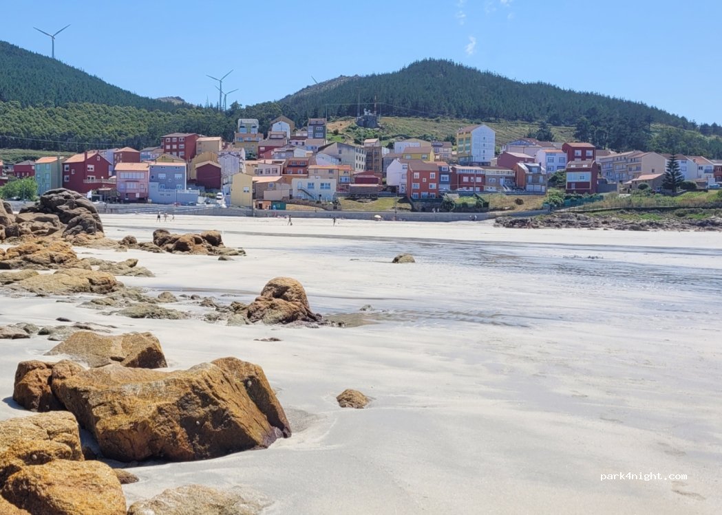 Lieu paisible. Très beau parking plat en face d'une plage superbe, petit village tranquille avec des maisons très colorées. Possibilité d'une très belle balade sur le sentier du littoral vers Camariñas. Toilettes fermées à cette époque. Je recommande.