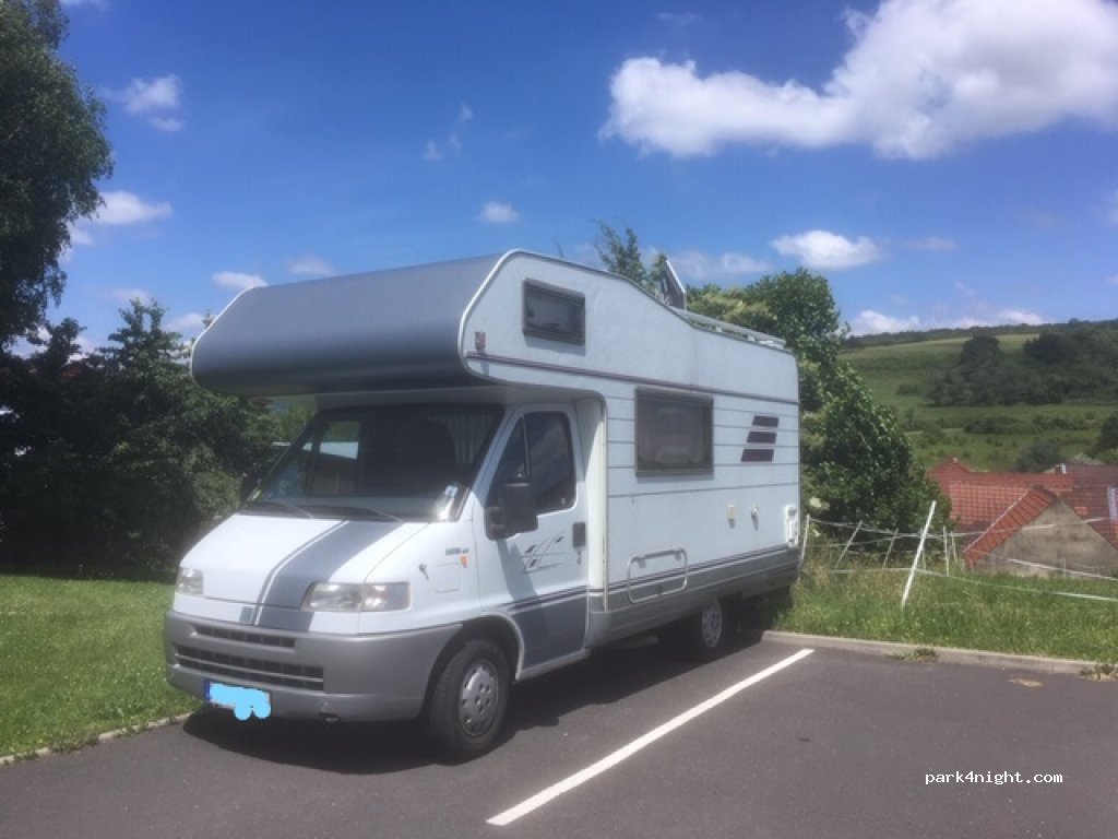 Kleiner Parkplatz auf Asphalt. Neben der Kirche daher ist es um 7 mit der Nachtruhe vorbei. Sehr ruhig, da am Ende des Dorfes. Nebendran gibt es den Bolzplatz