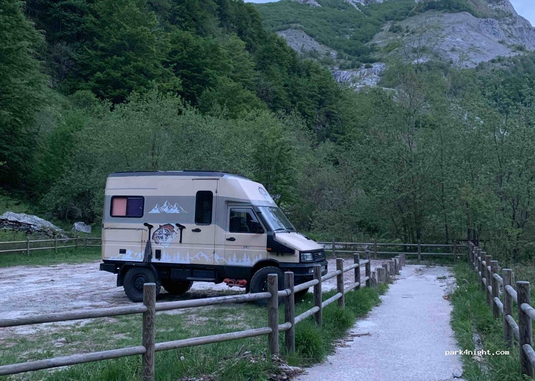 Val Serenaia car park. A truly intimate and evocative place. Discovered by chance during an alpine exploration on the Apuan Alps, with a direct view of Mount Pisanino, the highest of the Apuan Alps. The parking is perfectly flat, on a roadway along a stream that leads to the Val Serenaia Campsite. Next to the parking there is also a drinking fountain and a picnic table. We slept in Maggiolina, all quiet. near the parking there are 2 shelters where you can dine.