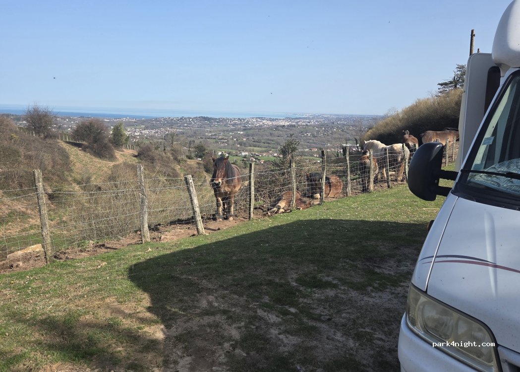 Lieux tres agreable, terrain vaste pour plusieurs vans avec accès correct, à peu près plat. Vue sur la Rhune et l'océan Troupeau en liberté, sans poser de problème. départ de randonnées