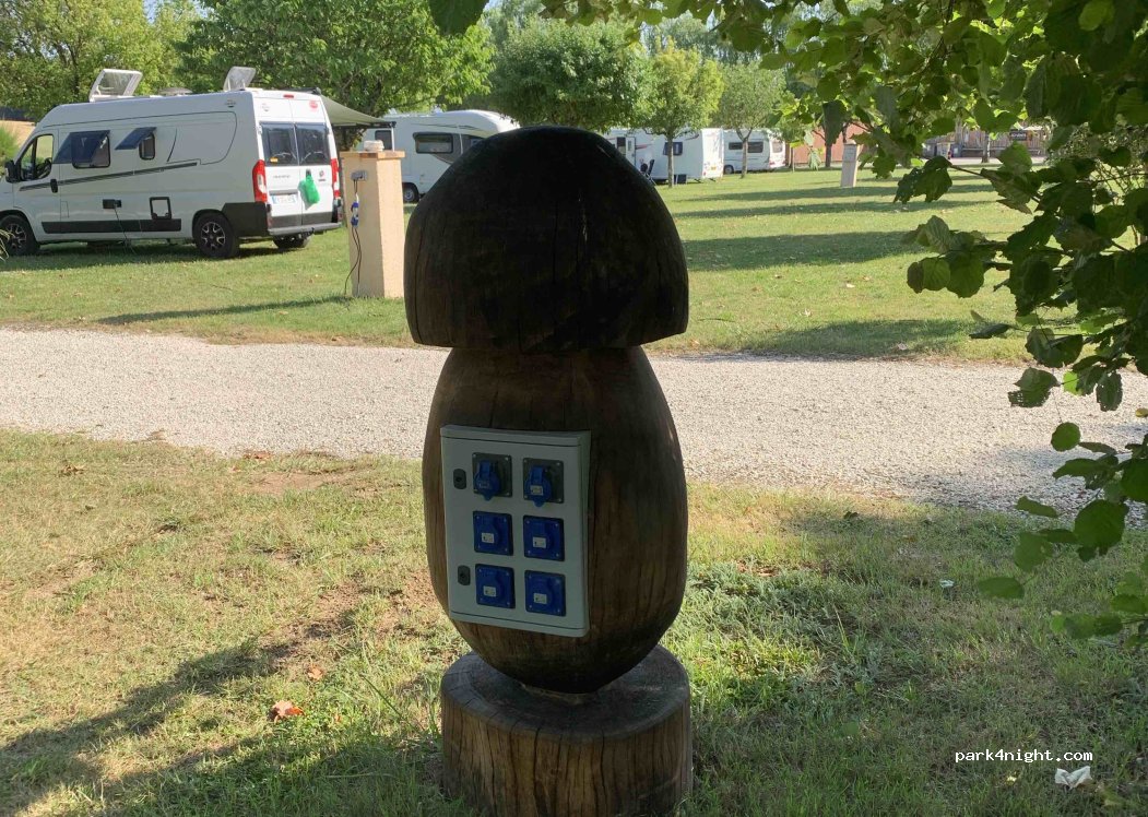 Ordentlicher und gepflegter Platz. Man kann kommen, sich hinstellen und wenn das Büro nicht besetzt ist, kommt der Bauer irgendwann zum Kassieren vorbei. Keine CEE-Steckdosen, nur normale französische Steckdosen (6A).