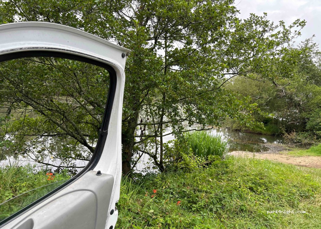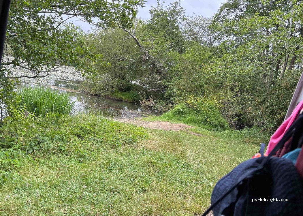 Idéal pour un réveil au calme et au frais. Coin très nature, étang poissonneux avec saut de black bass. Panneau réglementant la pêche mais pas vu d'interdiction de stationner pour camping-car. Balade à faire en forêt en suivant le petit sentier qui remonte la rivière (10 mn) et arrivée sur grande étendue de nénuphars...