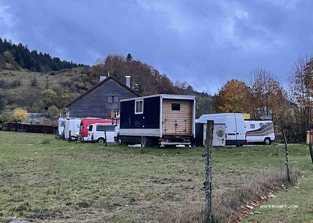 Bel emplacement sympathique goudronné et quasiment plat. Nuit très calme malgré la proximité de la route. Restaurant immédiatement à côté de l'aire. Accès lac et abbaye en traversant la route. Aucun service. T'es bien pour une nuit. Merci à ce petit village de nous accueillir si bien.