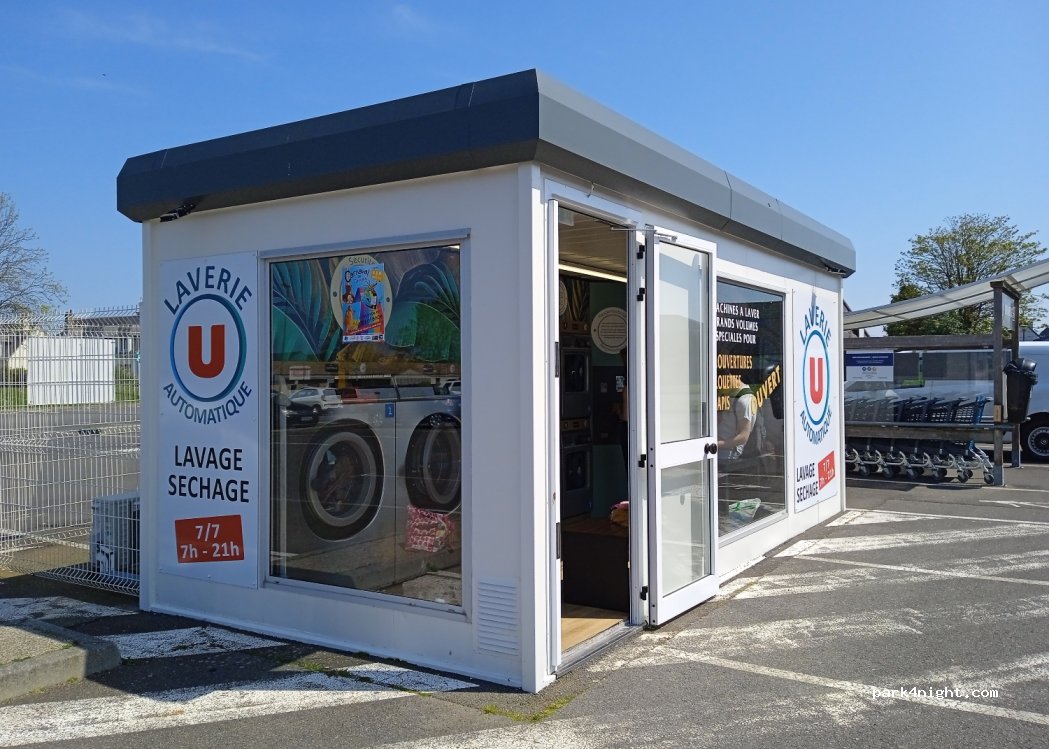 Large Super U car park, the rear part of which is reserved for motorhomes. Without service. 25 pitches behind the motorhome wash area. Washing machine and dryer machine price a little expensive