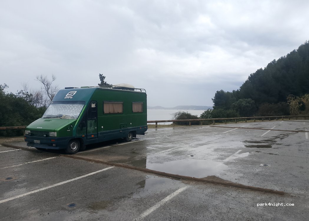Car park at Romaniquettes beach. Passed in winter, sunny place and like winter not many people except joggers and those who take their dogs out there. Walk along the salt lake and water point on the beach. Attention big turn when entering according to your direction of arrival (but my 6m20 without power steering passed). No overnight parking ban.