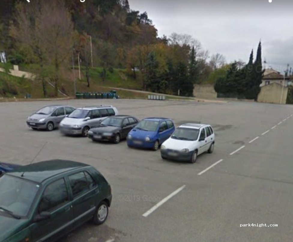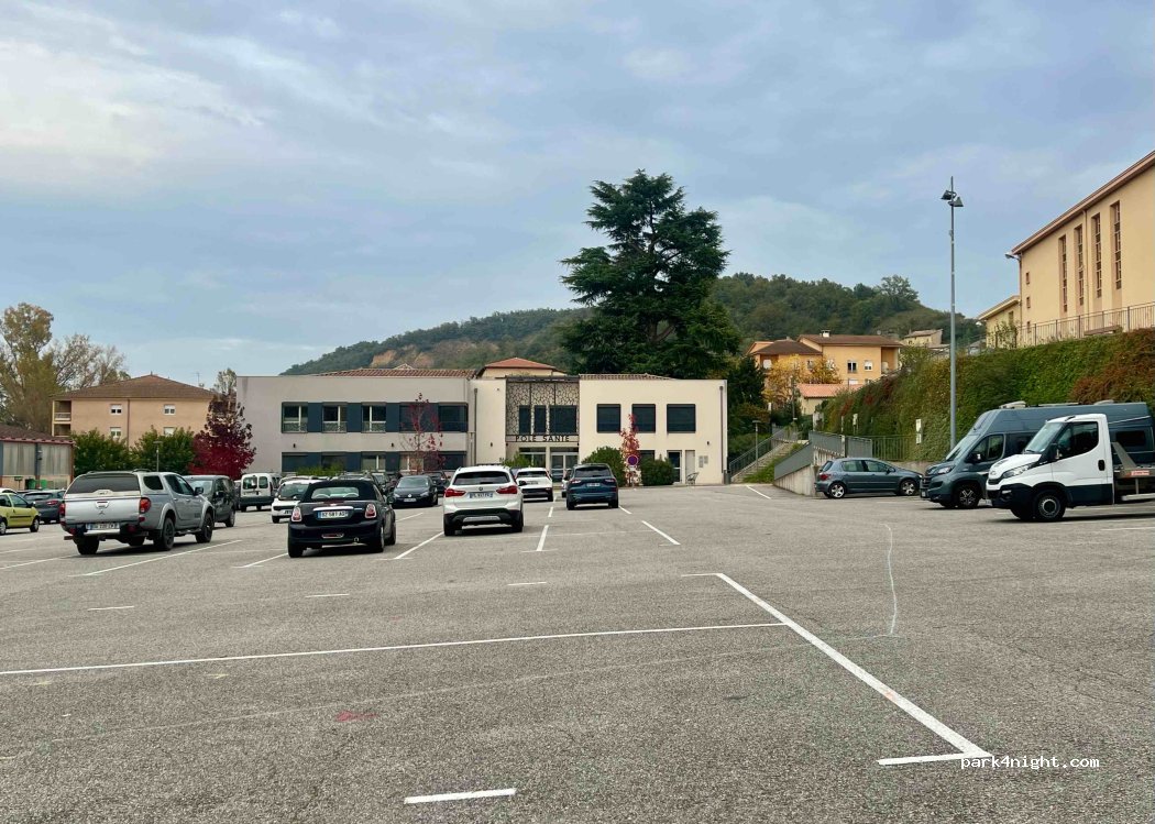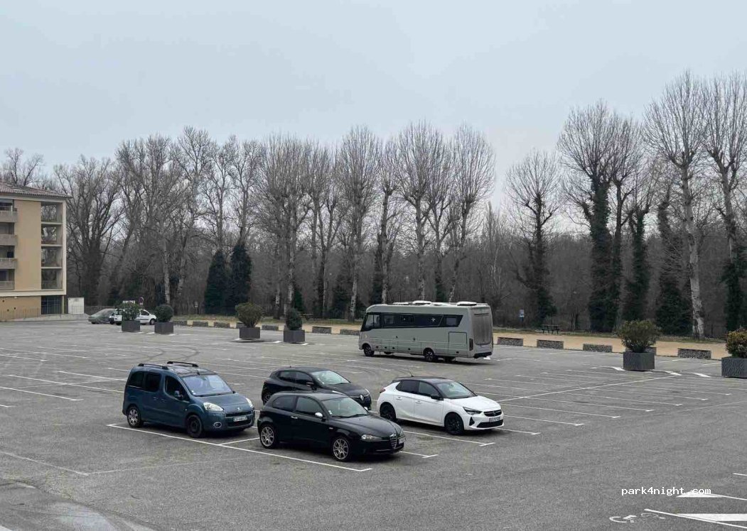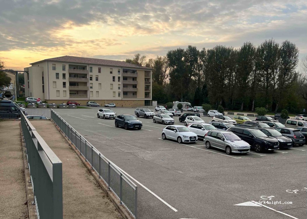 Sehr ruhiger, großer, asphaltierter Parkplatz, ohne Höhen- oder Gewichtsbegrenzung, mit einer Müllstation. Kostenfrei. Auch tagsüber nur etwa zu 30% belegt. Die Treppe hoch, ca. 100 m links im Ort ein CarreFour und eine tolle Bäckerei mit Partisserie, die sehr zu empfehlen ist.