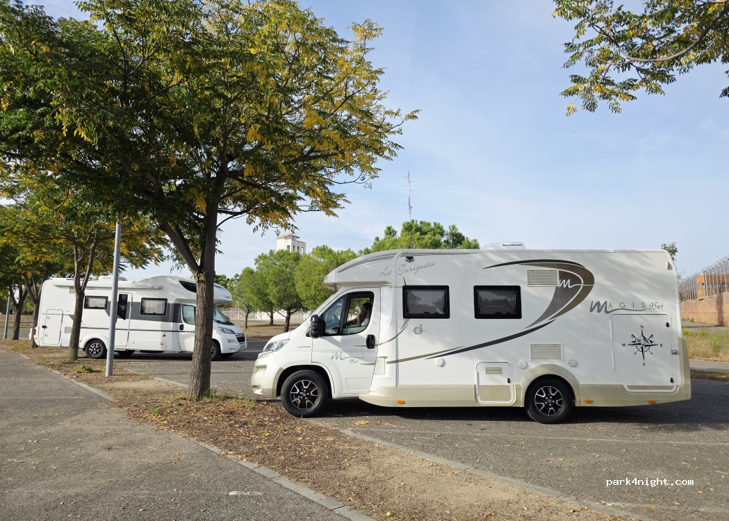 recomanable, i molt tranquil. no hi ha serveis. hem passat la nit molt tranquila. s'ha de arribar fins al pavelló per trobar containers i reciclar. hi ha un Caprabo al costat. al matí gent fent esport i passejant gossos. hem dormit tres campers.