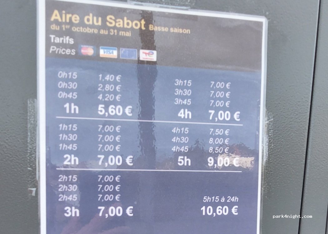 Le prix est de 10,60 pour 24h … mais si vous perdez votre tickets , c’est 10€60. Nous y sommes restés 3 nuits hyper calmes et paisibles . L’eau et les toilettes sont à faire à pieds à l’air de camping car (n’oubliez pas vos bidons). Franchement , les commentaires en dessous sont nuls. C’est juste un parking mais personne ne nous fait c h I e r. Les voisins sont cools. Astucieux tu seras!