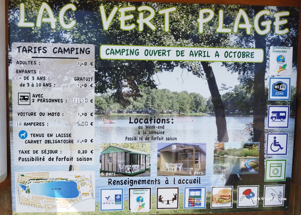 Camping Lake Green Beach. Around the lake, the campground of 423 delimited pitches with electrical connection and water point. Which makes it the largest campsite in the Meuse. Important space for camper with all services. Beach, water slide, laundry, snack bar, paddle boats, bowling, fishing. Close to all shops and services.