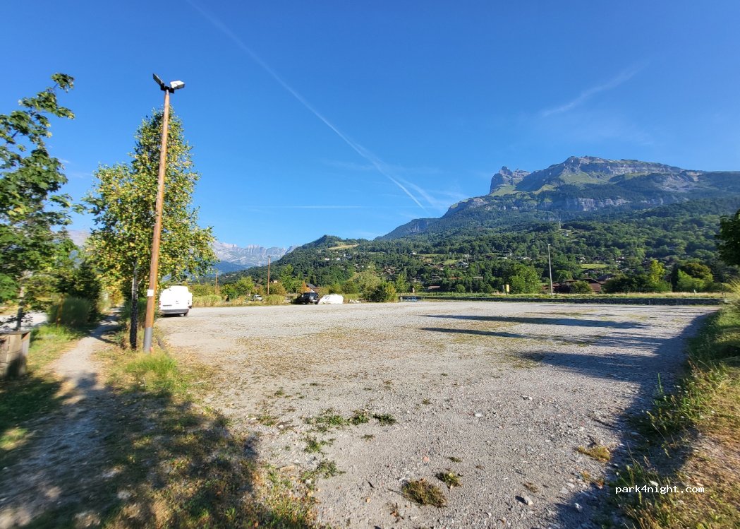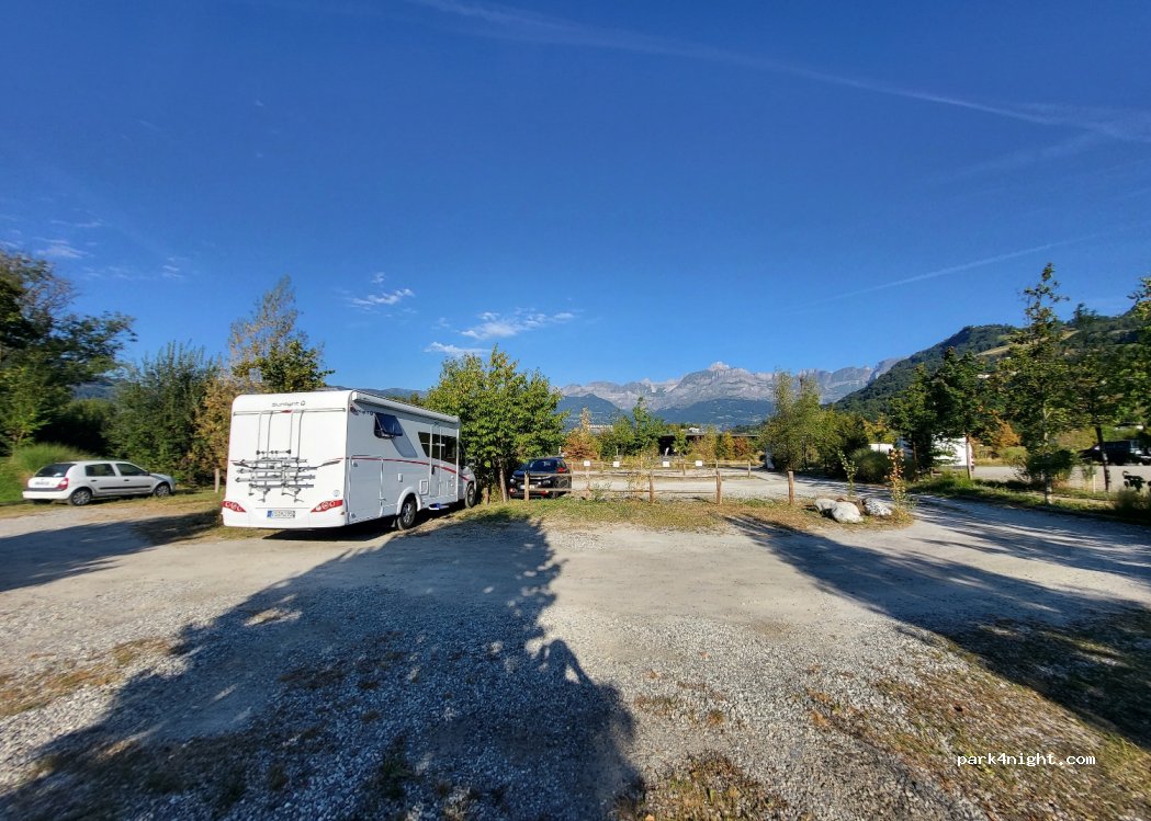 Entramos por la parte de 2.10 metros pero habia caravanas altas dentro. Muy tranquilo, plazas de parking muy llanas y sin ningun tipo de pago por aparcar. Cerca hay un supermercado que por la mañana utilizamos de WC. Perfecto si vas camino de Chamonix asi evitas las multitudes.
