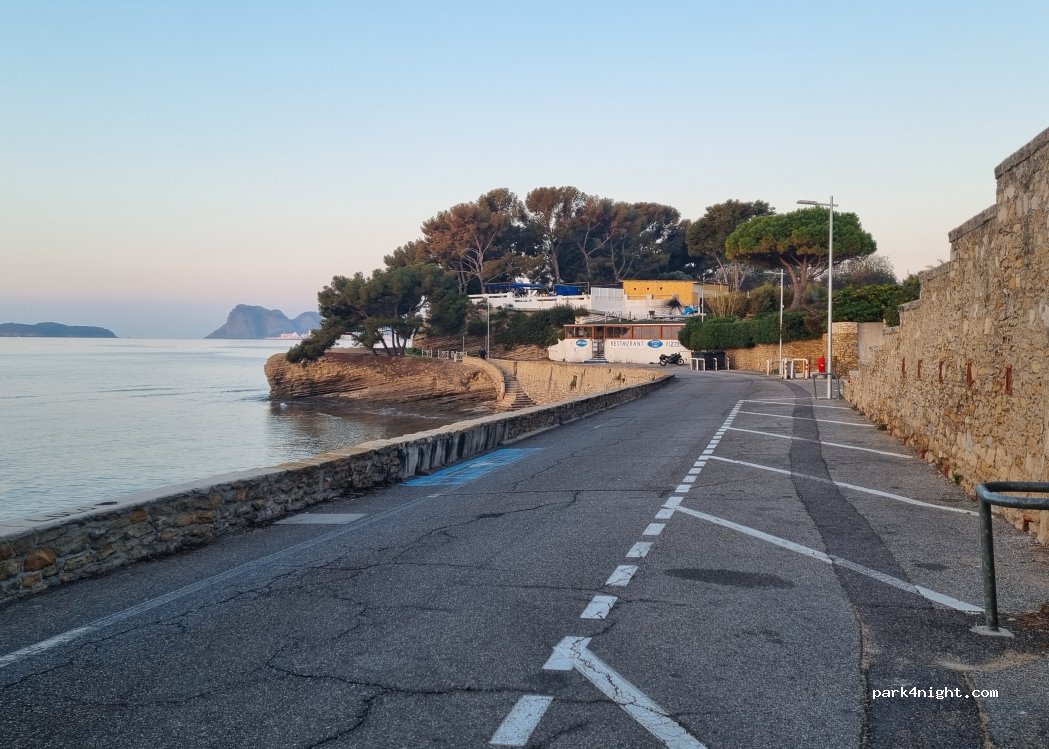 Bon spot en fond de mer et bord de route, plutôt calme après les départs de restaurants. La police municipale est passé 2 fois sans s'arrêter ni rien nous dire. Réveil agréable accompagné de quelques pêcheurs.