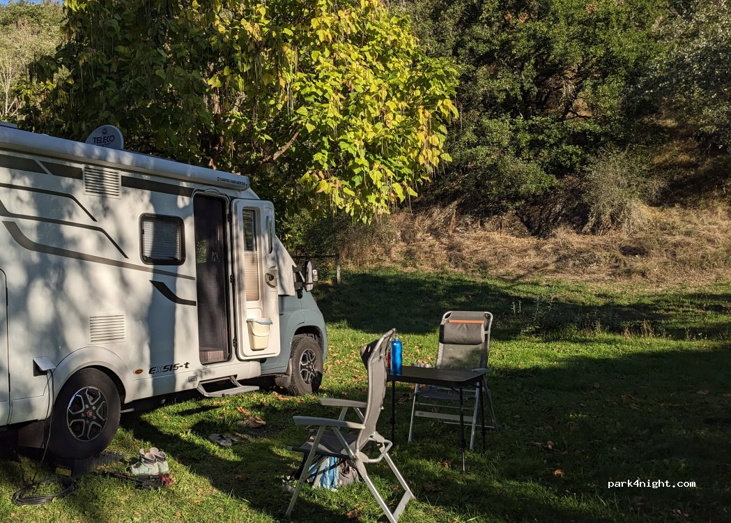 Absence de sanitaires, mais tout ce qu’il faut pour un camping-car avec de grands espaces ombragés, très tranquille bien entretenu.
