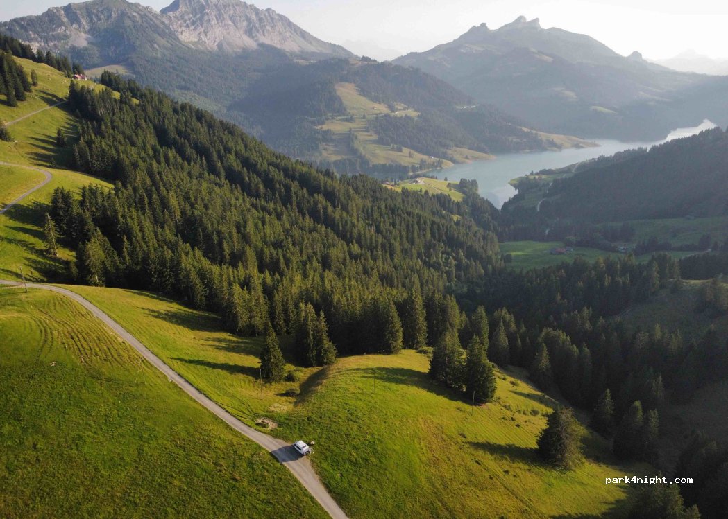 Simply magical place on the heights of the lake of Hongrin. We had spotted a natural place already referenced but which was taken so we continued the road to come across this bucolic grassy esplanade. Close to the road but almost no traffic. Incredible 360 degree view. Land not completely flat so wedge to be expected. In summer, the cows are probably not far away, make sure we don't disturb.