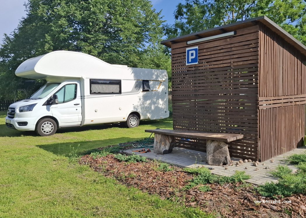 Grassy, fenced, lighted, unguarded parking 5 km from A1 motorway and 4 km from DK 91. Best access from the village Magdalenka, intersection next to a small red brick chapel. Parking fee, including sewage discharge and water filling - 30 PLN/24h. No sanitary facility. Call in advance.