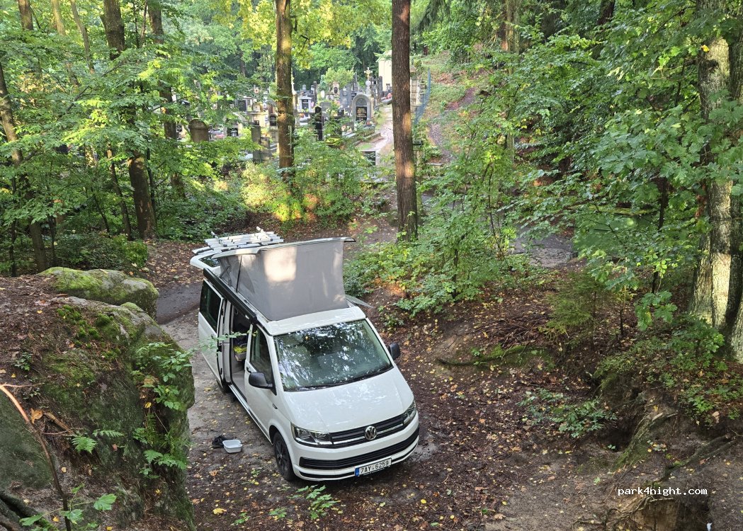 Parkovište u hřbitova. Je to klidné pěkné místo. Ráno pár důchodců co se jeli vyvenčit. Jinak klid.