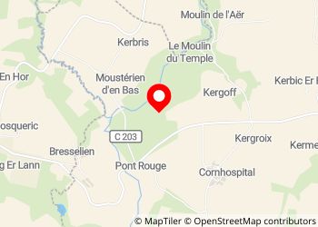 Aire de Kergof. Lieu de départ de randonnée VTT ou marcheurs. Isolée au milieu de la nature. Accès par un chemin bien dégagé 500 m environ.
